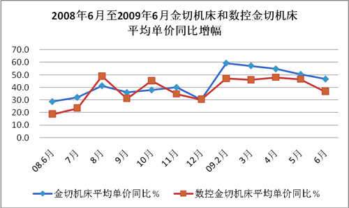 上半年市場需求結構加快了變化的速度,普通、低檔數控機床需求大幅度萎縮,大重型和高檔數控機床仍保持穩定需求。國民經濟各行業對機床的需求影響參差不齊,其中有些行業如鐵路、航空、能源等行業對機床依然有較大需求,汽車制造對機床的需求開始回升。機床協會對179家重點聯系企業統計:2009年1~6月,金屬加工機床產值數控化率為53.7%,同比增長7.7個百分點。金切機床產量和數控機床產量分別比同期降低37.7%和22.2%,但數控機床的產量占比由2008年的24.0%提高到30.0%,產品結構變化明顯。金切機床和數控金切機床平均單價分別為21.7萬元和48.4萬元,分別比去年同期提升了36.7%和46.7%。最近一年間,機床平均單價增速在加快,比一年前增加了10多個百分點。
